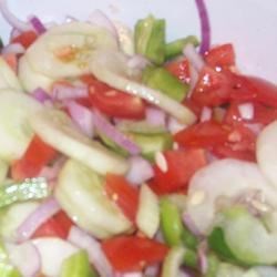 I make this salad using fresh tomatoes from my garden. The key is to let it marinate and chill for the flavors to blend.